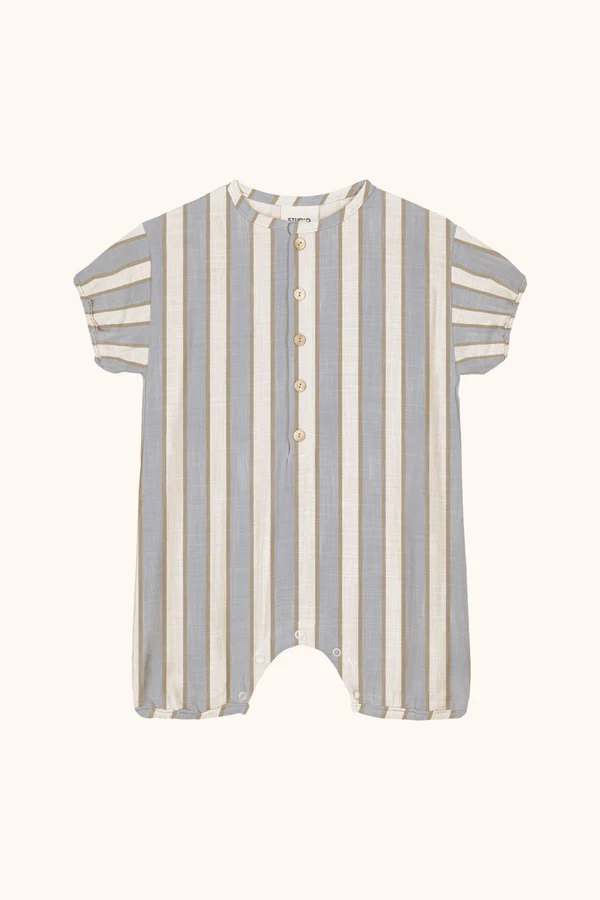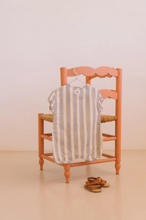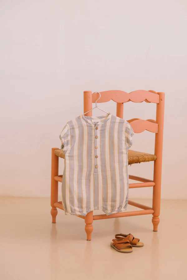 Le motif rayures bleu gold associe un bleu doux à des touches dorées, pour un rendu à la fois chic et estival. Ce coloris apporte une touche élégante et moderne aux tenues de bébé.